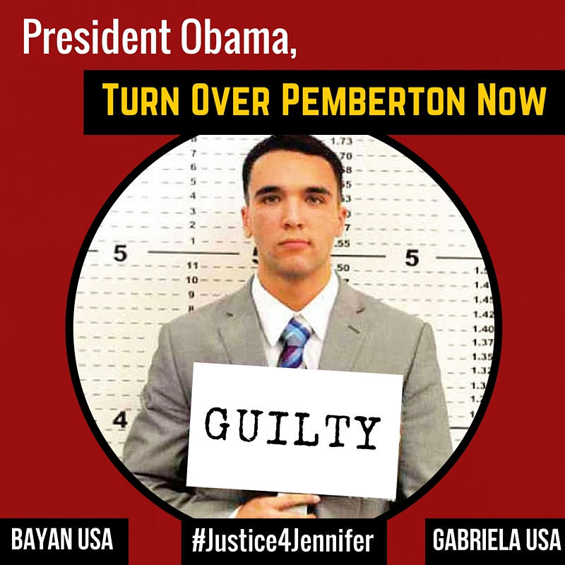 The U.S. and Philippines have had a long history of unequal relations. From brutal colonial rule to treaties that serve the U.S. 1%, the U.S. has always bullied the Philippines instead of treating the country as an equal partner. In the case of Pemberton, the U.S. is using the Visiting Forces Agreement (VFA) to shield Pemberton from serving his jail sentence and to dodge its diplomatic responsibility to hand the convicted Marine over to Philippine authorities. Until agreements like VFA and the new Enhanced Defense Cooperation Agreement are eradicated, we expect that violence and injustices committed against Filipino women and children will happen repeatedly and without consequences. We demand that President Obama stop violating Philippine sovereignty and order Pemberton to be turned over to Philippine authorities immediately.