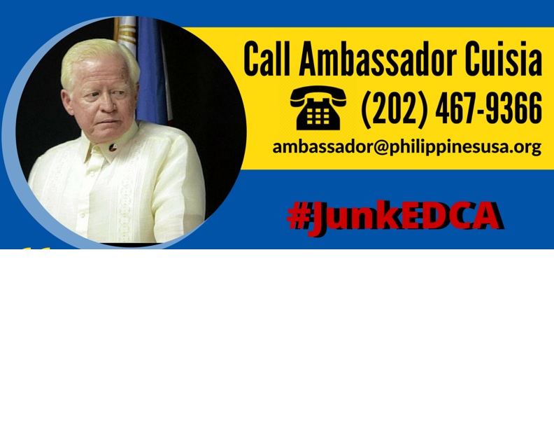 Please take a brief moment to join GABRIELA USA, Anakbayan-USA, and BAYAN USA in today’s national call-in action by calling Philippine Ambassador Cuisia at (202) 467-9366 to express our outrage and condemnation of the Enhanced Defense Cooperation Agreement (EDCA) and to demand that the Aquino administration uphold Philippine sovereignty by junking EDCA. Unequal agreements between the US and Philippines like EDCA and the Visiting Forces Agreement (VFA) are direct causes of Jennifer Laude’s murder and attacks on countless other women and children due to US military occupation. With the implementation of the EDCA, we can expect these human rights violations to worsen.
