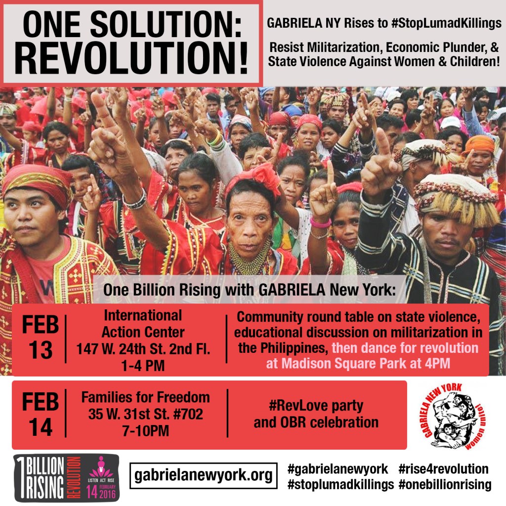 Join GABRIELA New York for a series of weekend events February 13-14 as we Rise for Revolution with One Billion Rising in 2016. People all over the world will join together to demand an end to violence against women and children in all of its forms such as poverty, domestic violence, forced migration, and displacement caused by entities like the military and the state.