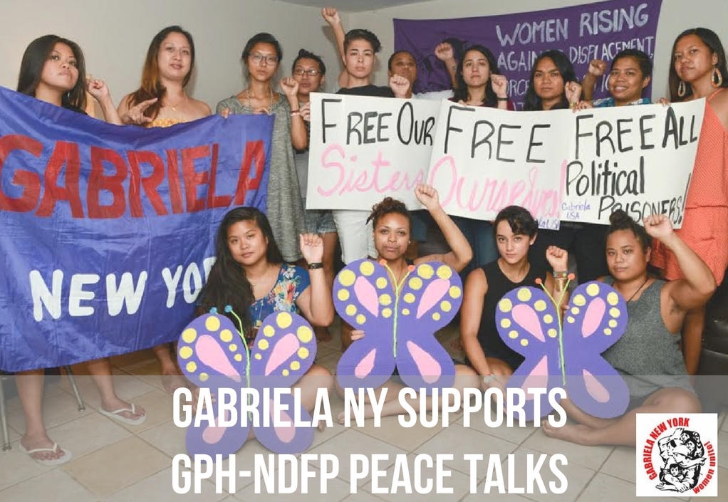 In lieu of the resumption of the peace talks between the Government of the Republic of the Philippines (GRP) and the National Democratic Front (NDF), GABRIELA NY and all chapters of the national alliance – GABRIELA USA – continues to support the peace negotiations and the immediate call to release all political prisoners. There are more than 500 political prisoners in the Philippines, over half of which were imprisoned under the Benigno Simeon Aquino III regime. Across the country, 48 women continue to languish in jail, unjustly imprisoned, facing false trumped up charges. The arrests of these women interfere in carrying out their participation and leadership in women’s organizations and people’s movements.