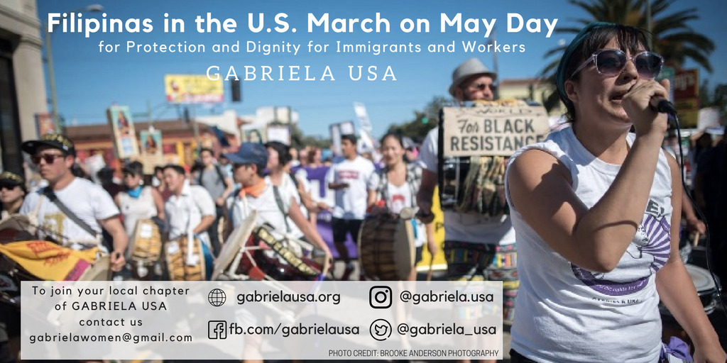 Representing Filipinos who are working in low-wage industries and also professional sectors, GABRIELA USA members marched for dignified and respectable working conditions. Nationally, members are waging and supporting campaigns on livable wages, wage theft, and an end to human trafficking and forced migration. GABRIELA USA calls our community, families, and our allies to RISE, RESIST, and UNITE: RISE against fascism, RESIST militarization, and UNITE for self-determination and liberation for all oppressed peoples. With the demand to protect and preserve the dignity of immigrants and workers, mass organizations remain committed to organizing in our communities and among the ranks of working women in order to advance the struggles of workers and all the oppressed. On May Day and everyday, GABRIELA USA stands with immigrant communities and workers whose labor, skills, and contributions advance the U.S. economy, allowing society to run and function daily.
