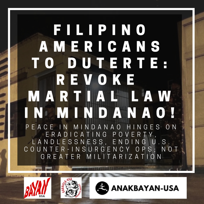 BAYAN-USA, Anakbayan-USA and GABRIELA USA condemn the declaration of martial law by the Duterte administration in Mindanao and call for it to be immediately revoked to ensure the protection of civilian communities from greater militarization and violence.